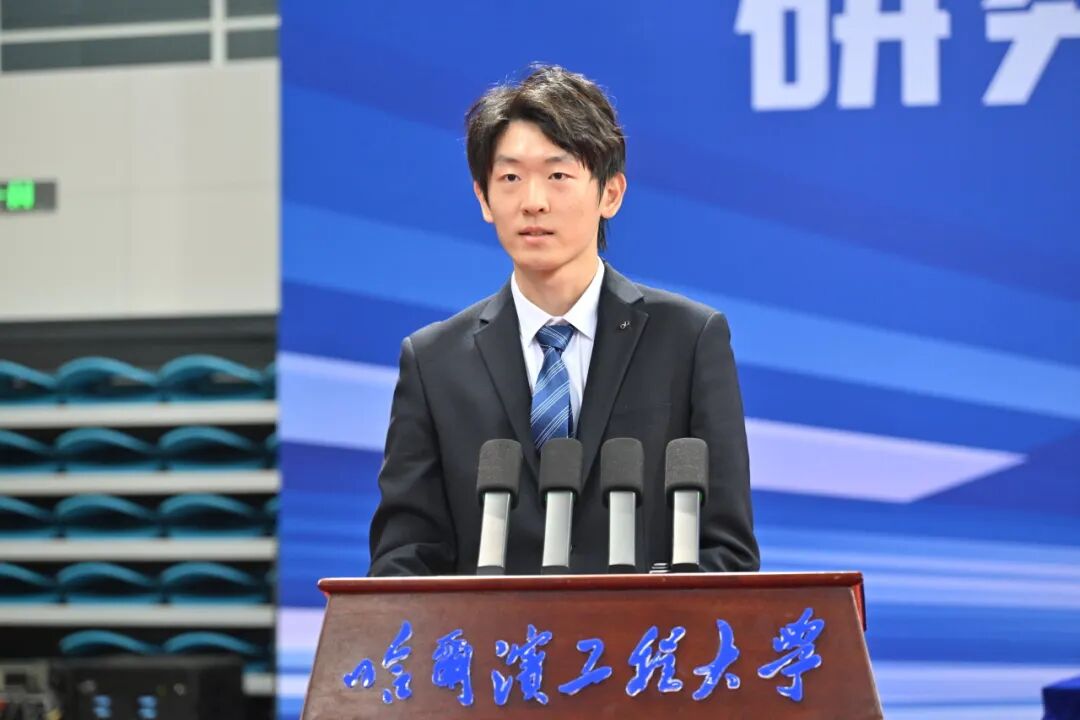 智能科学与工程学院2025级博士研究生张圆清作为新生代表发言。他表示,在哈工程求学收获的不止知识的积累与学历的提升,更有不断向前逐梦深蓝的底气。未来将在学术道路上踏实前行,以所学助力强国强军,用行动推动龙江振兴。